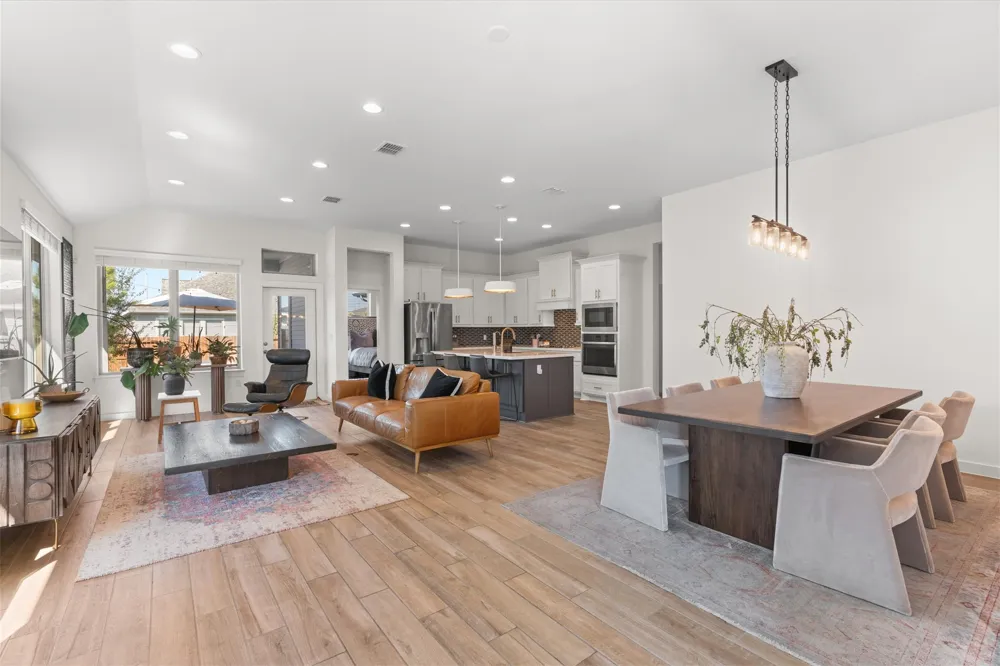 Easton Park 3 bedroom, 2 full bath single-story home with a dedicated office and easy indoor–outdoor living sits in the heart of one of South Austin’s most park-filled, community-focused neighborhoods. Easton Park is known for wide streets, trail access, and everyday walkability to pools, parks, and green space, and this home places all of that just outside the front door. Inside, the layout opens to a dedicated office immediately to the right of the entry, set apart from the main living areas and flexible enough to also function as a bedroom. Wood-look tile flooring runs throughout the common spaces, while large windows bring in light from multiple sides of the home. The living room feels open and comfortable with high ceilings, recessed lighting, and windows that wrap the space, flowing naturally into the kitchen and dining area. The kitchen sits at the center of the home with a large island and breakfast bar, quartz countertops, dual-tone cabinetry, and a tile backsplash. A gas cooktop, built-in oven and microwave, and a walk-in pantry keep the space efficient and connected to daily living. The primary suite is located at the back of the home, offering separation from the secondary rooms. Neutral-toned walls, generous windows, and a spacious layout lead into an ensuite bath with separate vanities, a soaking tub, a step-in shower, and a walk-in closet. Out back, a large covered patio extends the living space outdoors. Turf, pavers, and xeriscape landscaping create a low-maintenance yard that works well for entertaining, lounging, or play. Life in Easton Park includes multiple neighborhood parks just down the street, the community pool and dog park only a couple blocks away, and trail systems woven throughout the neighborhood. The location also keeps Austin within easy reach, with Austin-Bergstrom International Airport about 9 miles away and McKinney Falls State Park roughly 3 miles from home.
